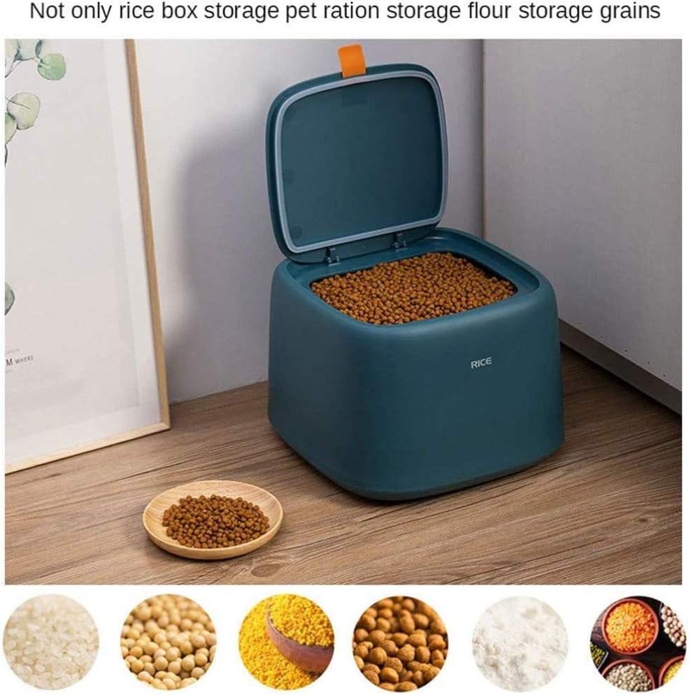 Reason for selection:1. The capacity of the rice storage container is 10 kg. You can simply fill rice into a bucket and don't have to worry about refilling a small storage container time and time again.2. Sealed design: Sealed storage can better protect the freshness and dryness of food.3. The rice dispenser is an important humanized kitchen organisation for storing and storing rice wherever you want to place it.4. Ideal for rice, sugar, flour, grains, beans and pet food.Product parameters:Product Name: Grain Storage ContainerMaterial: PP + food grade siliconeCapacity: 10 kgSize: 27 × 27 × 21.5 cm.Colour: Ark blue / light blue / pink / white.Package list: 1 x grain dispenser