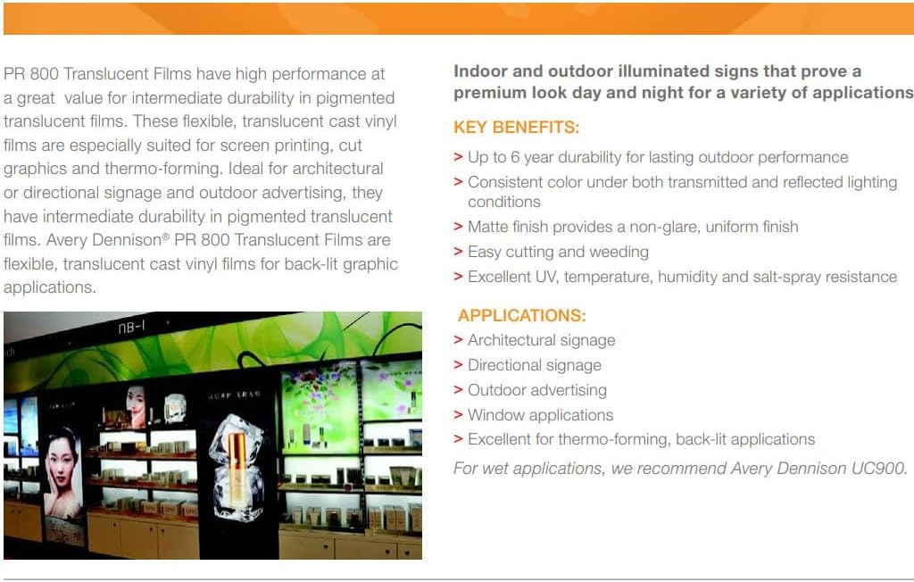 Avery Dennison PR 800 Premium Cast Translucent intermediate films are flexible translucent cast vinyl films which are designed for non-specified computer-cut graphic applications including internallyilluminated signs and awnings. Avery Dennison PR 800 Premium Cast Translucent films offer excellent cutting and weeding on computer sign making equipment, and adhere to a wide variety of properly prepared substrates. Should be applied to flexible backlit scrim, glass, polycarbonates, and acrylics (should be tested prior to use)
