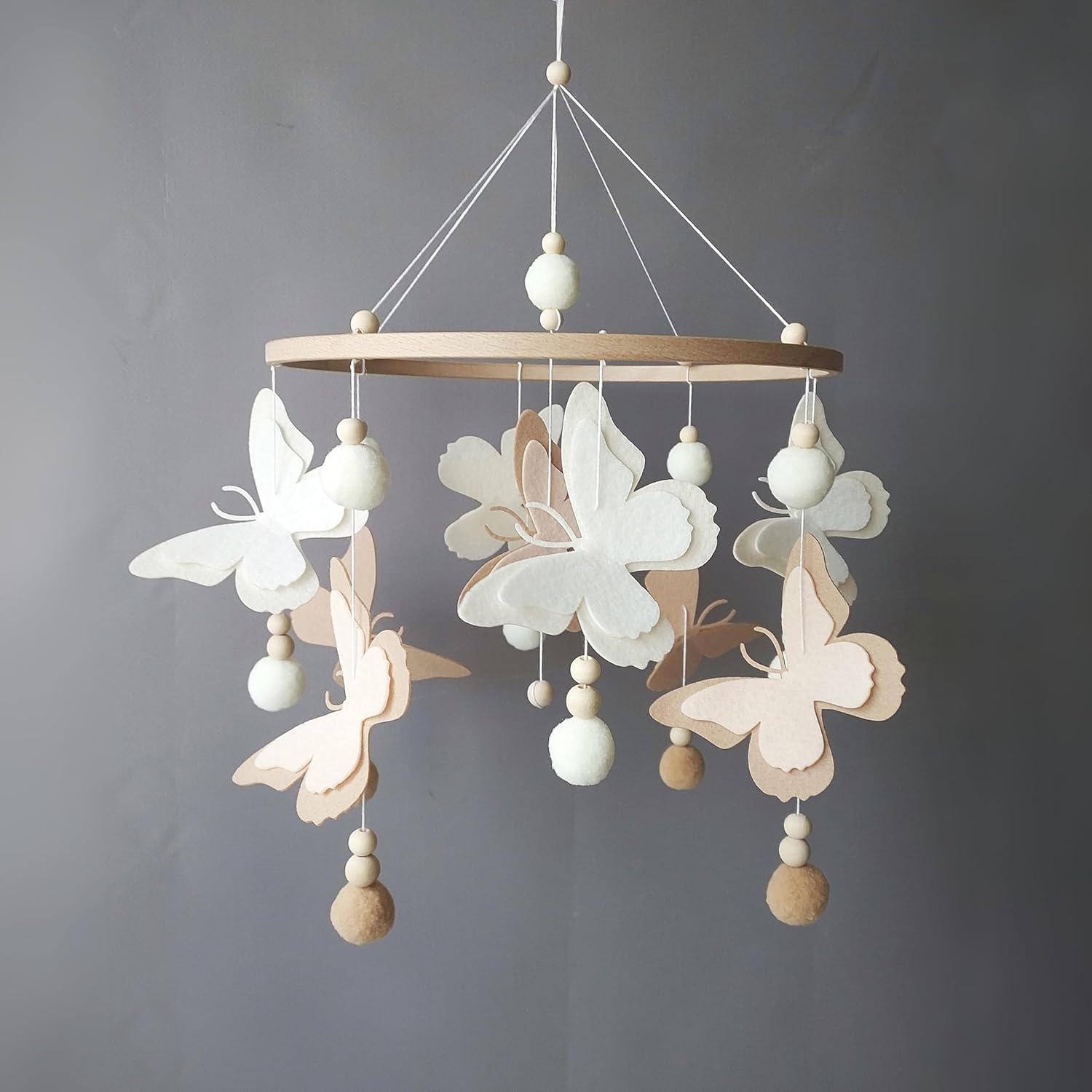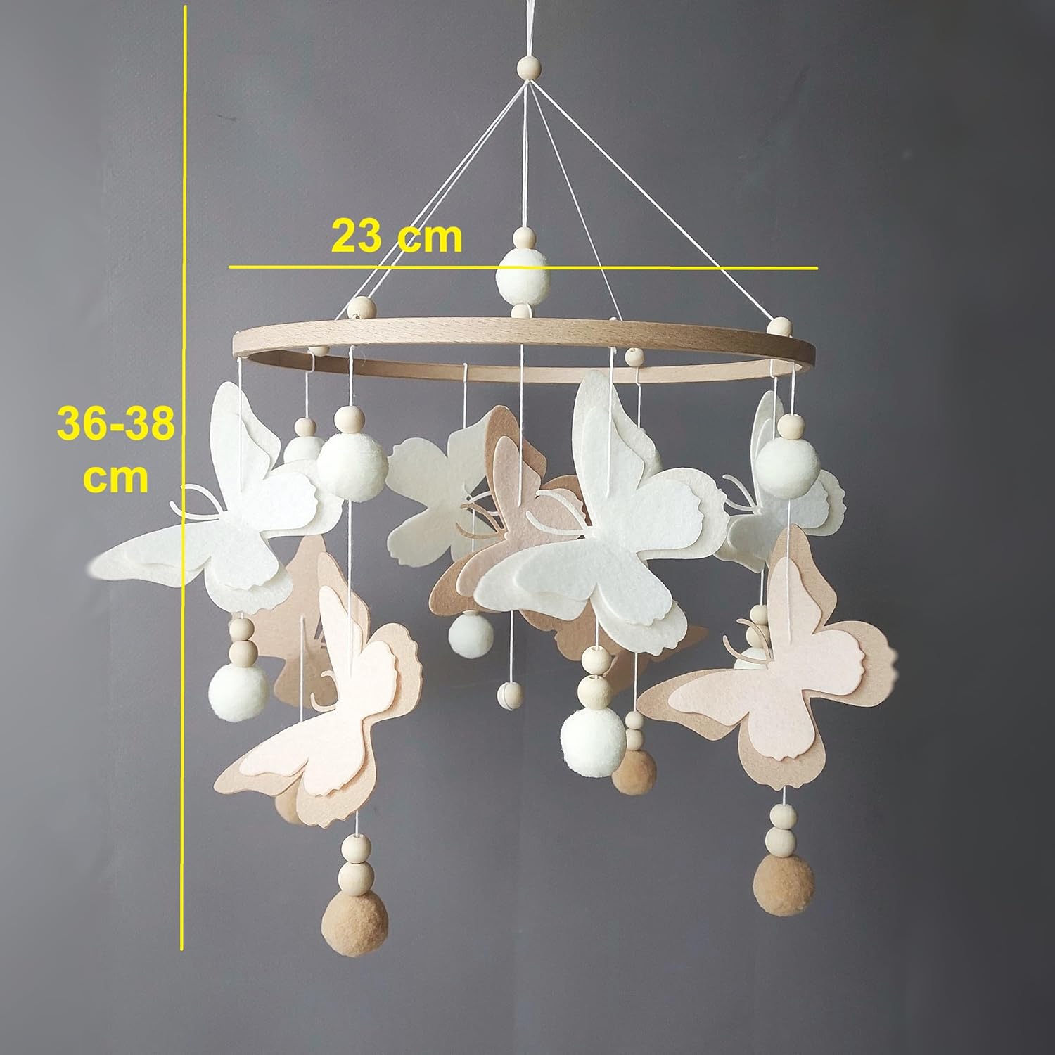 Enchant your little one's nursery with this delightful baby crib mobile featuring a whimsical design of butterflies. Crafted with care, this charming mobile will captivate your baby girl's attention and create a soothing, dreamy atmosphere in her cozy space. Perfect as a baby shower present or nursery decor, it adds a touch of magic to your little one's world. * SIZE: circle diameter 23 cm (9.5 inch) mobile height 36-38 cm (14-15 inches) * made from hypoallergenic materials * for decorative purposes only. Use a secure hook and keep the baby out
