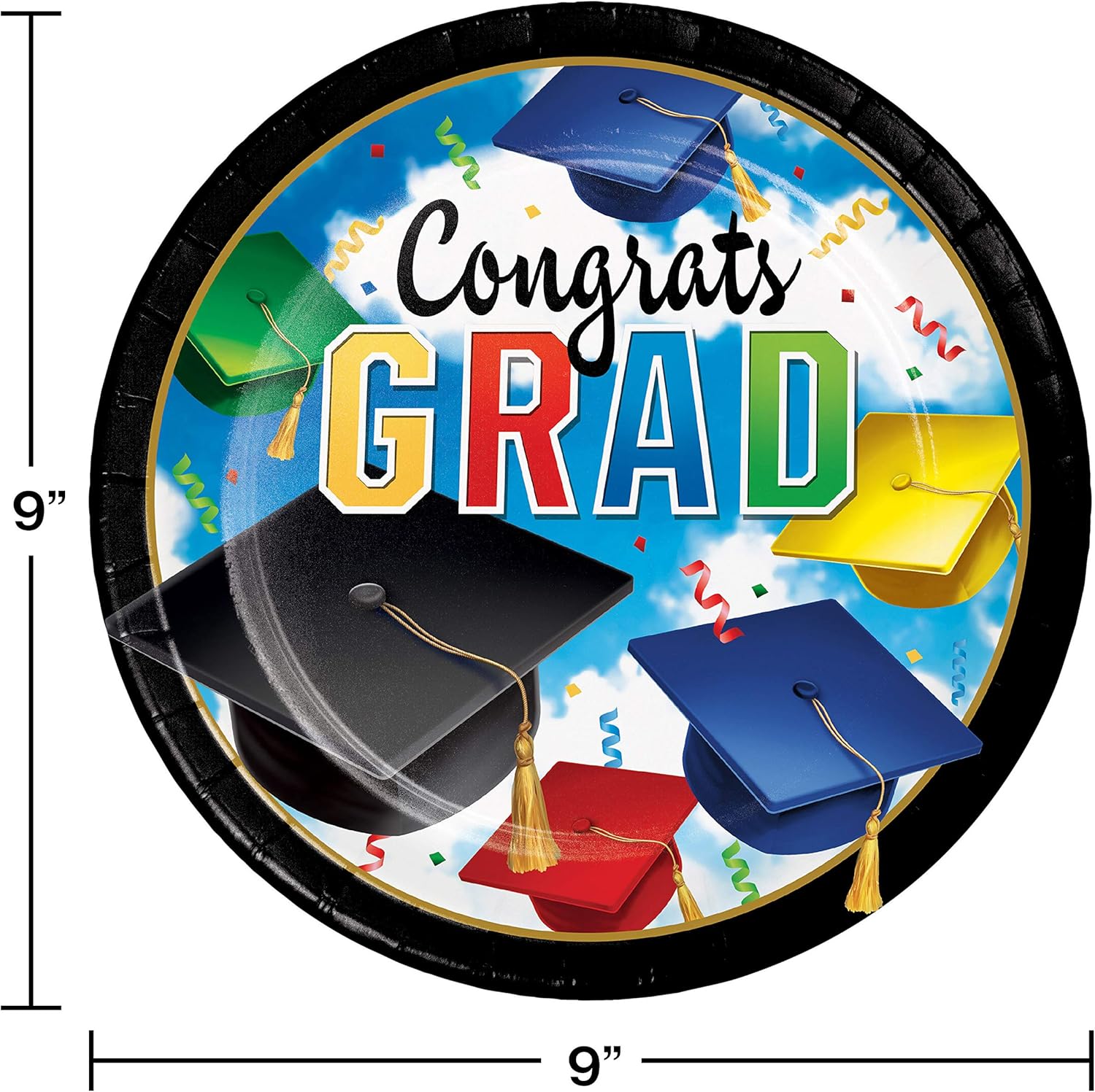 Provide the perfect tableware for heartier meals at the Grad party with the graduation celebration plates. These sturdy style paper plates feature a variety of colorful mortarboards tossed into the Sky, & "Congrats Grad" Message in the center, and will provide a nice touch to the end of a long journey. The 9" plates come in bulk packs of 50 and can be coordinated with other graduation celebration theme tableware to celebrate the hard-working graduate's accomplishment.
