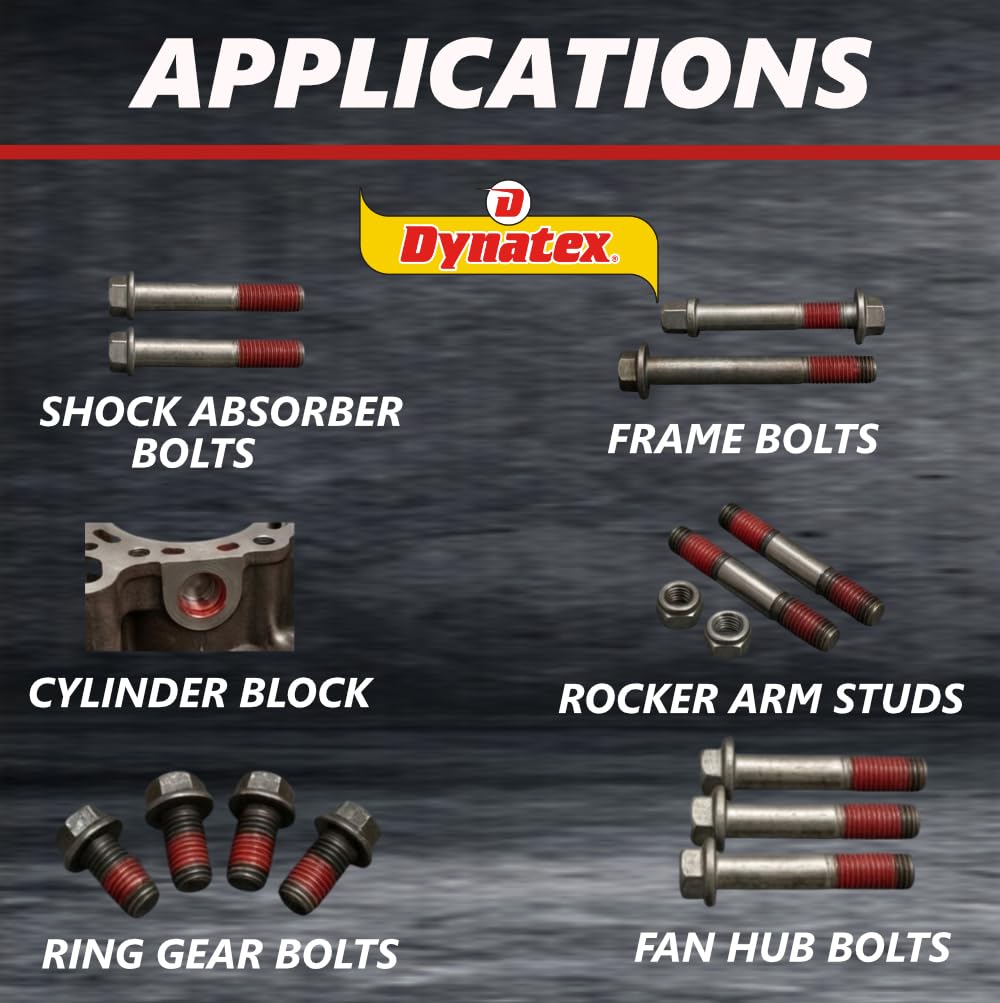 Dynatex Red High Strength Threadlocker is a single component, anaerobic liquid which cures when confined in the absence of air between close fitting metal surfaces. It is designed for the permanent locking of threaded fasteners. The product performs on aluminum, steel, plated fasteners, stainless steel, and special alloy parts. It exhibits good temperature stability and is solvent resistant. It will lock and seal large fasteners and is used in applications where shock and vibration may cause the fastener to loosen.
