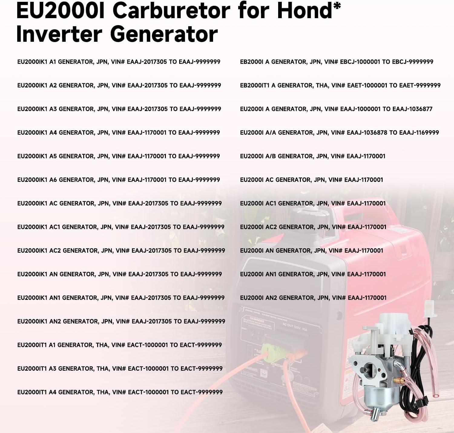 | Compatible with Vehicle Type | For Hond* EU2000I (A A/A A/B AC AC1 AC2 AN AN1 AN2), EU2000IK1 (A1 A2 A3 A4 A5 A6 AC AC1 AC2 AN AN1 AN2), EU2000IT1 (A1 A3 A4) inverter generator |