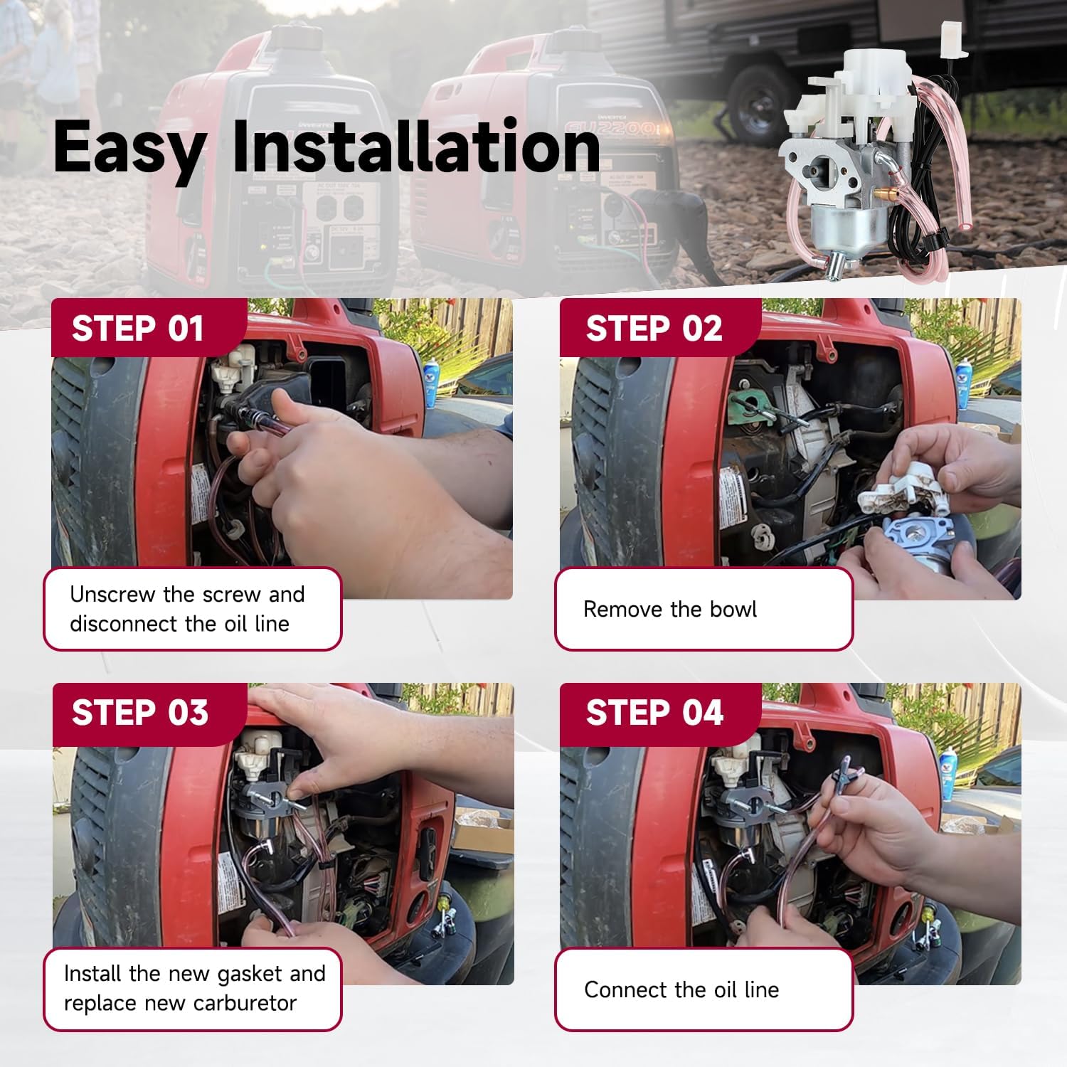 | Included Components | 1 X carburetor, 2 X air filte* cotton, 3 X paper pad, 1 X spar* plu-g, 2 X oil filter, 1 X fuel pump, 1 X fuel line hose, 1 X fuel shutoff valve, 12 X clips |