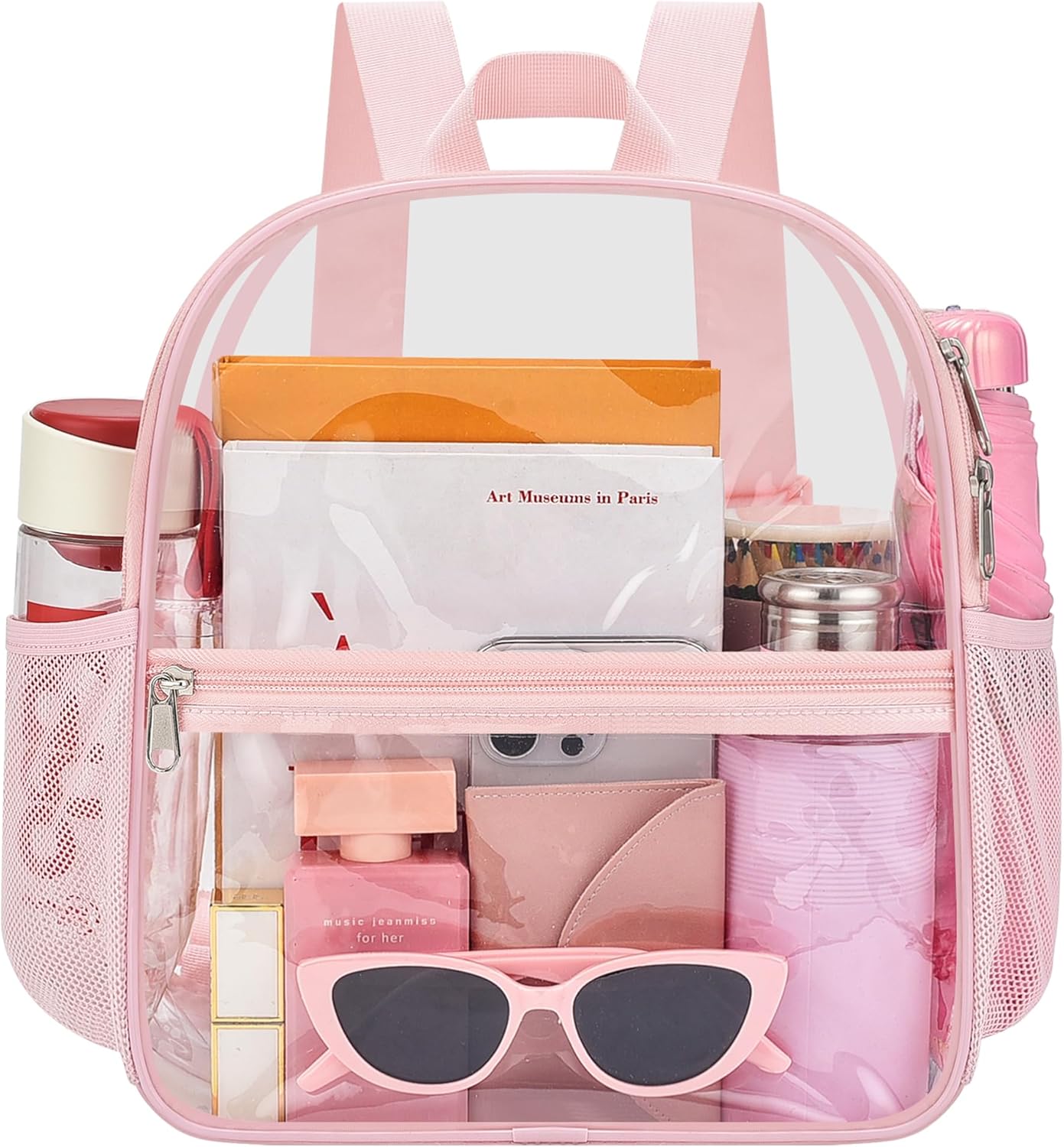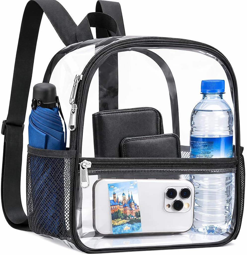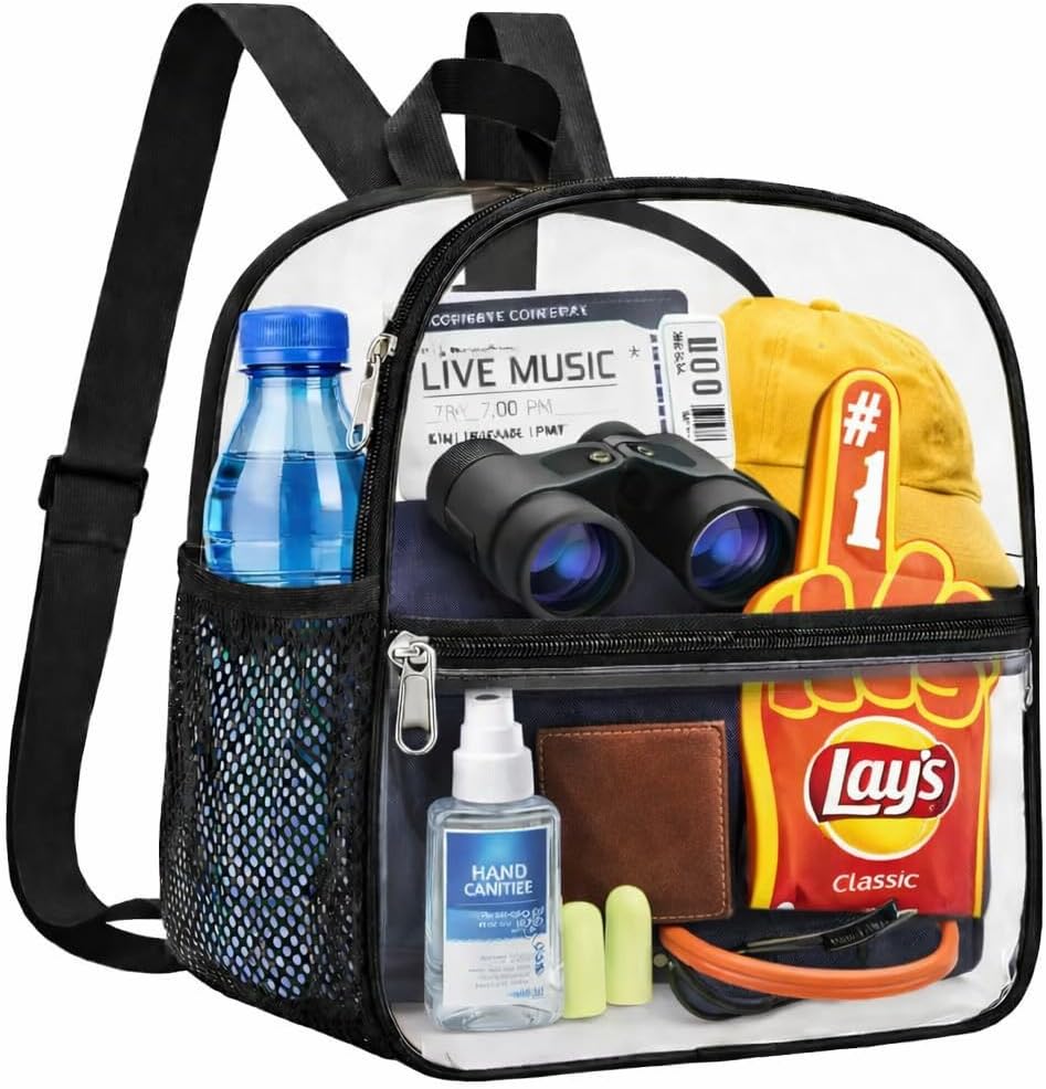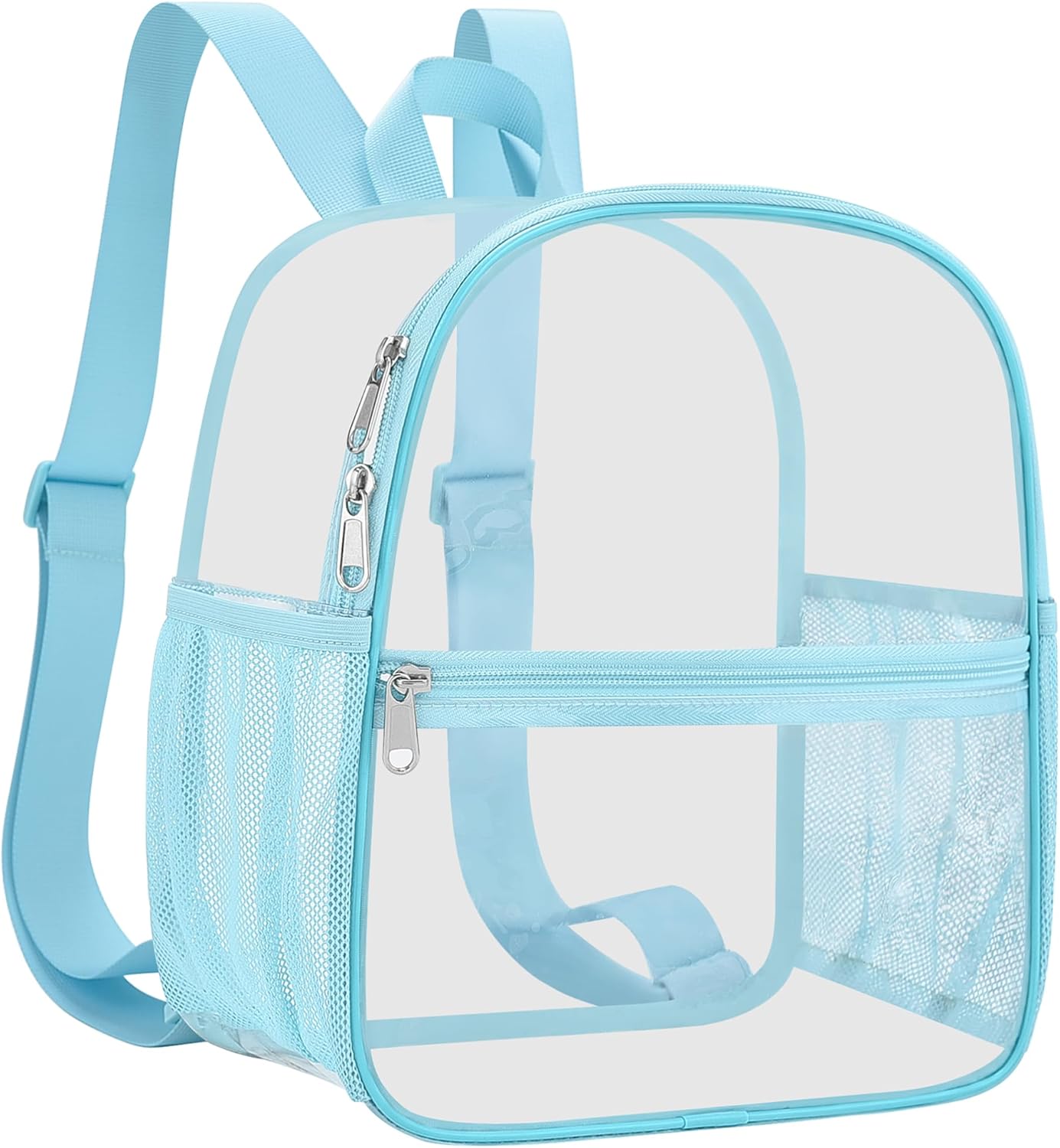 OrabenClear Mini Backpack is lightweight and durable, it’s made from heavy duty cold - resistant PVC. Ideal for everyday use, heavy-duty clear PVC plastic construction that’s both completely transparent and water resistant, which helps keep clothes, books, folders, and files dry and protected. Great for work, travel, concert and sporting. Specifications Dimensions: 1 x Large Main Compartment: 12” x 11” x 6”(H * L* W) The roomy interior provides plenty of space for books, notepads, folders, personal items, and more. 1 x Front Pocket: 5.5" x 11" (H* L) It’s large enough for personal items you would need such as purse, cards, pens, keys, smart-phone, earphone, etc. 1 x Side Mesh Pocket: 6” x 6” (L* W) Great for your umbrella, water bottle or any items. 1-2cm error due to manual measurement is normal, please refer to the actual product. Intended Use For -Unisex -Office Workers -Travelers -Concert -Sport Event -Everyone who carry must-haves, etc. Maintenance Tips - Please wipe it gently with a clean damp cloth and dry it in shade when stained with dirt. - Please tightly wrap it into the bag and stay in cool and dry when not use for a long term. - Note that the odor is natural but will soon fade with use. 【WARNING】--CHOCKING hazard-small parts, Not for children under 3 years.