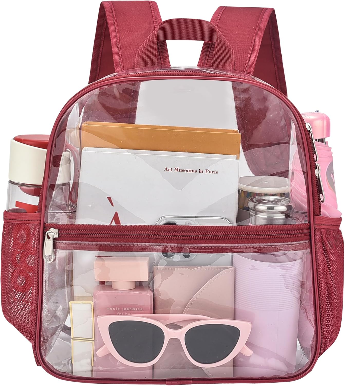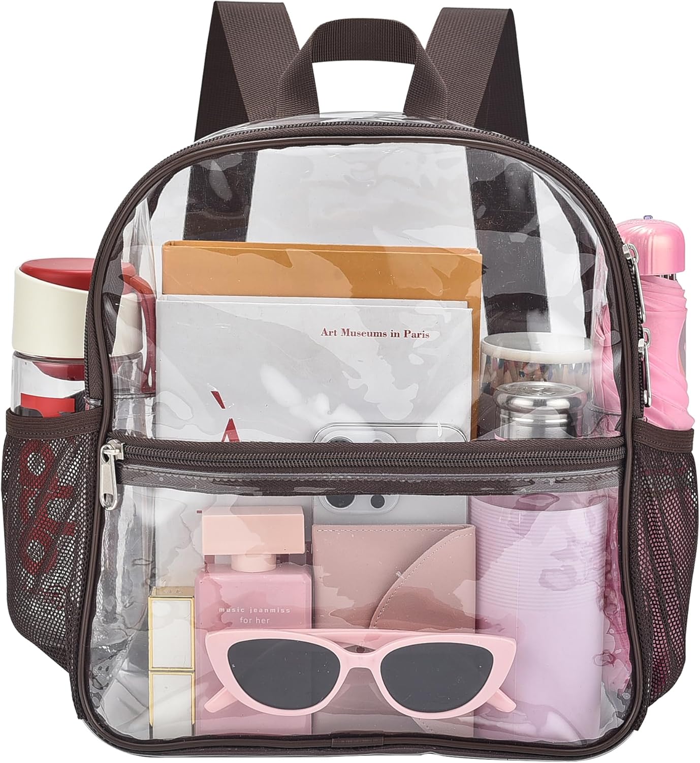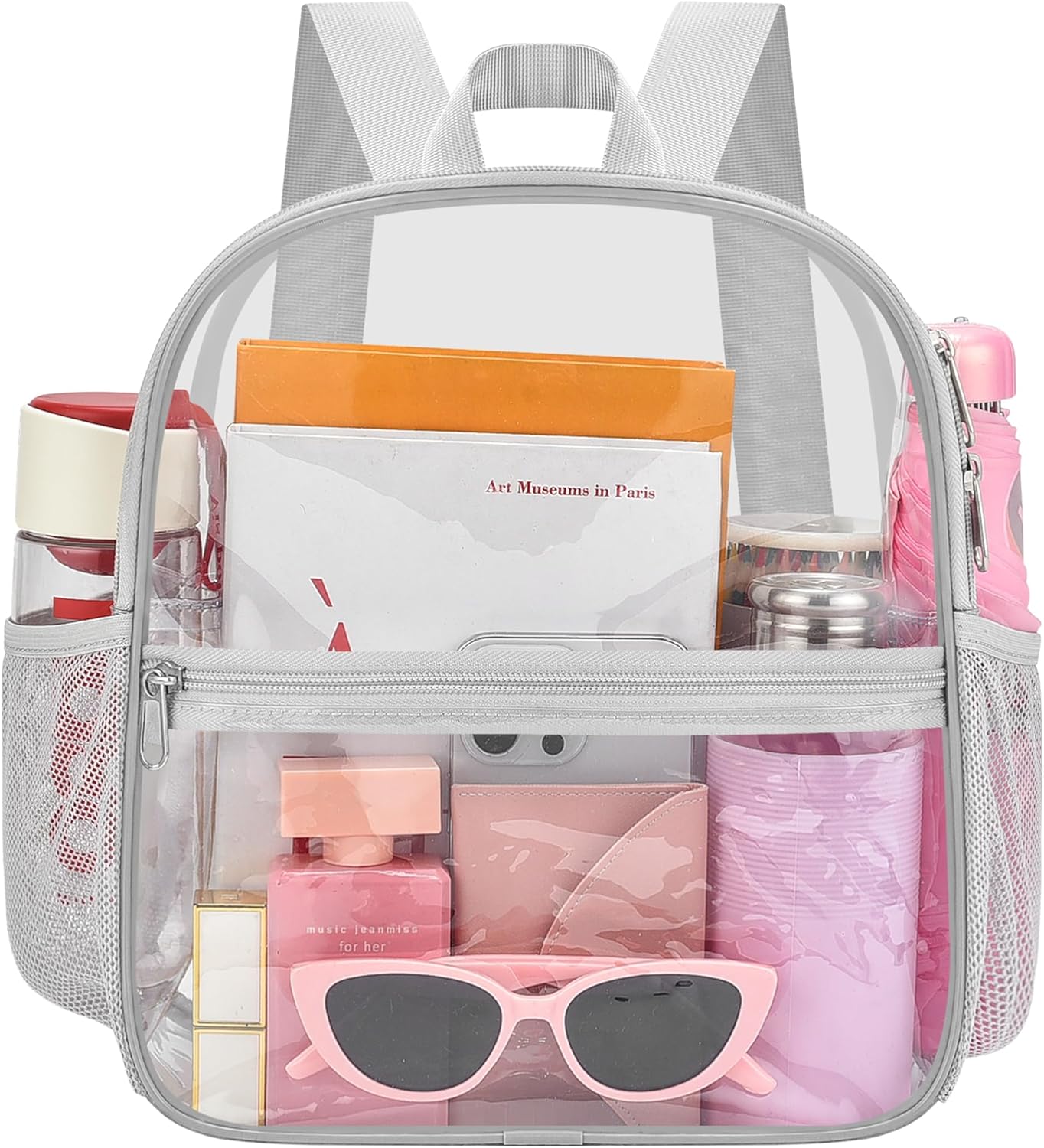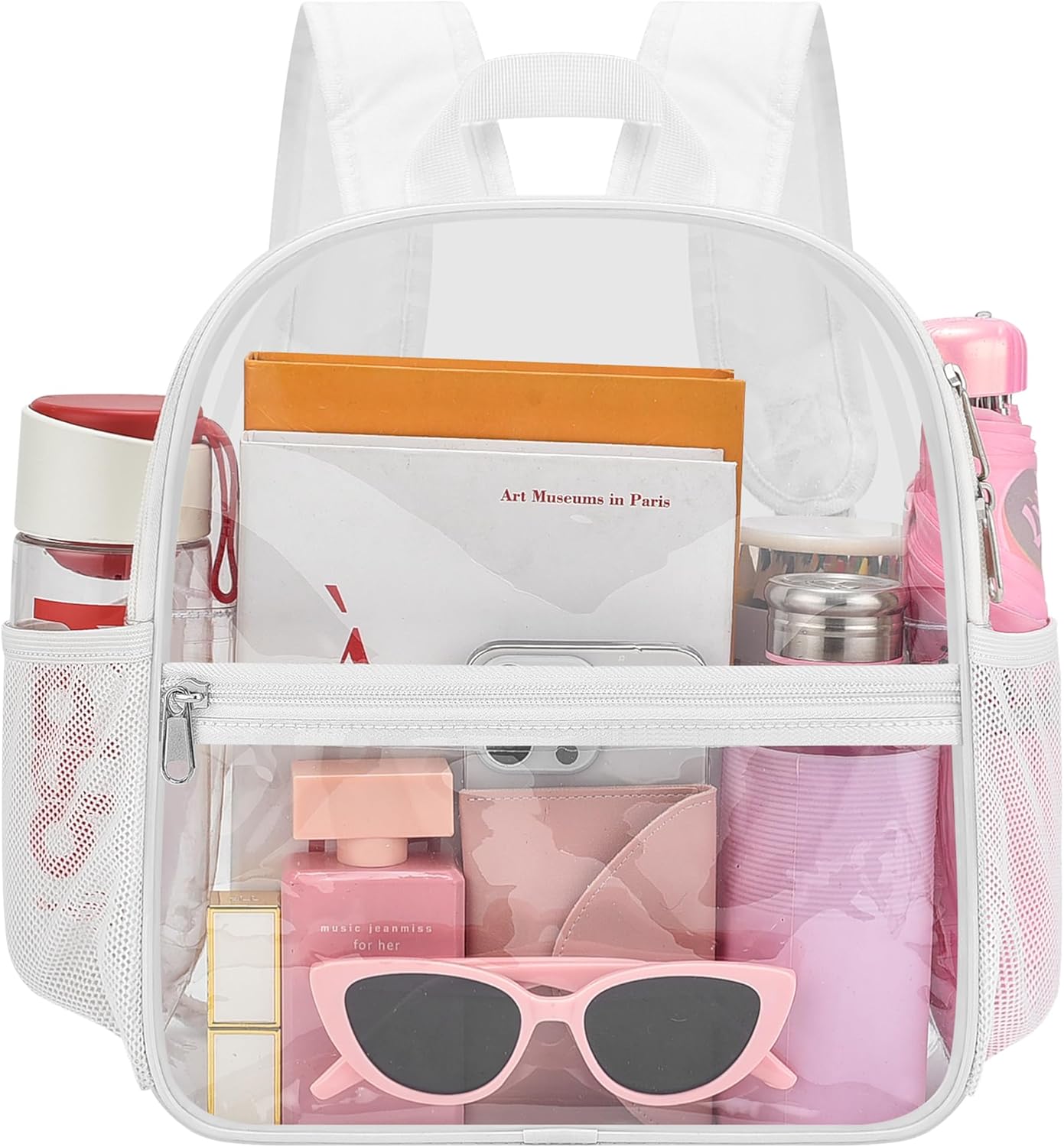 OrabenClear Mini Backpack is lightweight and durable, it’s made from heavy duty cold - resistant PVC. Ideal for everyday use, heavy-duty clear PVC plastic construction that’s both completely transparent and water resistant, which helps keep clothes, books, folders, and files dry and protected. Great for work, travel, concert and sporting. Specifications Dimensions: 1 x Large Main Compartment: 12” x 11” x 6”(H * L* W) The roomy interior provides plenty of space for books, notepads, folders, personal items, and more. 1 x Front Pocket: 5.5" x 11" (H* L) It’s large enough for personal items you would need such as purse, cards, pens, keys, smart-phone, earphone, etc. 1 x Side Mesh Pocket: 6” x 6” (L* W) Great for your umbrella, water bottle or any items. 1-2cm error due to manual measurement is normal, please refer to the actual product. Intended Use For -Unisex -Office Workers -Travelers -Concert -Sport Event -Everyone who carry must-haves, etc. Maintenance Tips - Please wipe it gently with a clean damp cloth and dry it in shade when stained with dirt. - Please tightly wrap it into the bag and stay in cool and dry when not use for a long term. - Note that the odor is natural but will soon fade with use. 【WARNING】--CHOCKING hazard-small parts, Not for children under 3 years.