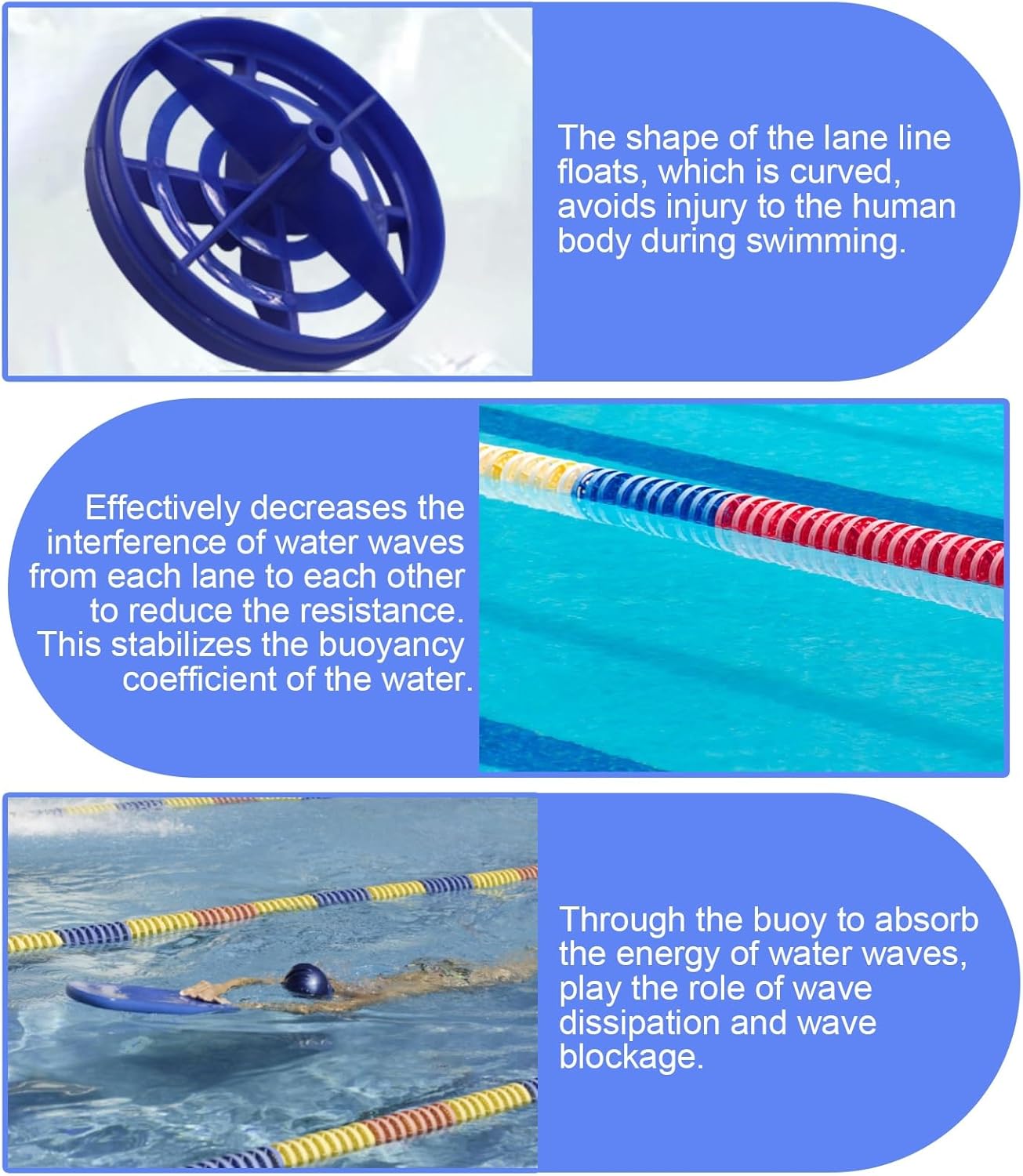 ❖ Clearly visible swimming pool safety rope used to delineate hazardous areas while also being used to create lanes for swimmers to safely practice swimming or compete in races.❖ Specification- Float Material: Polyethylene- Float Size: Diameter 5.5 cm (2 1/8"), Length 11 cm (4 3/8")- Rope Material: Nylon or Steel Wire- Number of Pool Buoys: 17/m(3.2ft)- Color: Red, Yellow, Blue- Whether Assembly is Required: Yes❖ Feature- Excellent visibility, easy identification.- Long service life is not easy to deteriorate.- Easy to install.- Eliminate wave resistance.- Can withstand chemicals in swimming pools.- Separate pool competition/practice lanes.- Separate the shallow and deep ends of the pool.❖ Package Contents- 1 × Pool safety divider rope❖ Warm Tips- Due to different display and different light, there may be some color difference between the picture and the product.- Due to manual measurement, there is a 1-2 cm error, specific to the actual size shall prevail.❖ After-sales Service- If you have any questions about monitor stand, please do not hesitate to contact us, we provide 24-hour customer service.