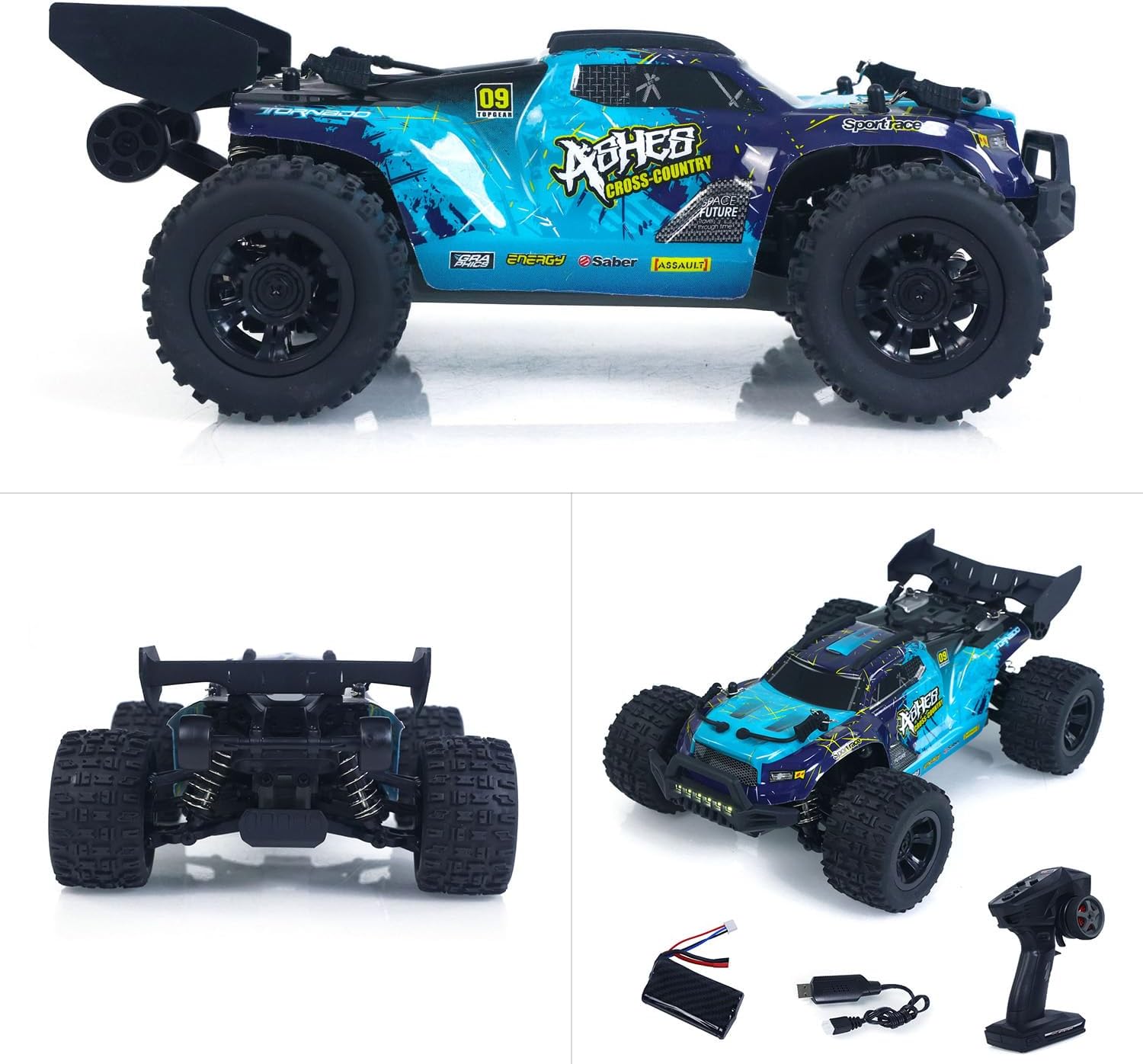 #18101 Muti-Terrain 1/18 2.4GHz Sync Remote Control Off Road Vehicle PVC Body RC Electric Monster Truck Wheelie Bar LED Light #Specification: Item Condition: New, Painted and Assembled Material: Plastic, Metal Color: Blue Scale: 1/18 Size: 29*19*10.3CM Net Weight: 840g Motor: 380 Brushed Motor ESC: 25A Brushed ESC(Splash protection) Servo: 17G 5Wire Servo Vehicle Battery: 7.4V 2S T Battery (Included) Remote Controller Battery: 3X AA Battery (Not Included) Charging Time: 3-3.5h Runtime: About 15 Minutes Remote Control Distance: About 80 Meters Maximum Speed: 28KM/H Tire Width: 155MM Wheelbase: 165MM Wheel Diameter: 67mm ID: SCY-18101-BR-RTR-BU #The Package Includes: 1/16 RC Off Road Car Model Motor Servo ESC Light System Remote Controller and Receiver Charger Vehicle Battery Instruction Manual Tools #The Package Does Not Include: Sound System Battery of Remote Controller (Recommand 3X 1.5V AA Batteries)